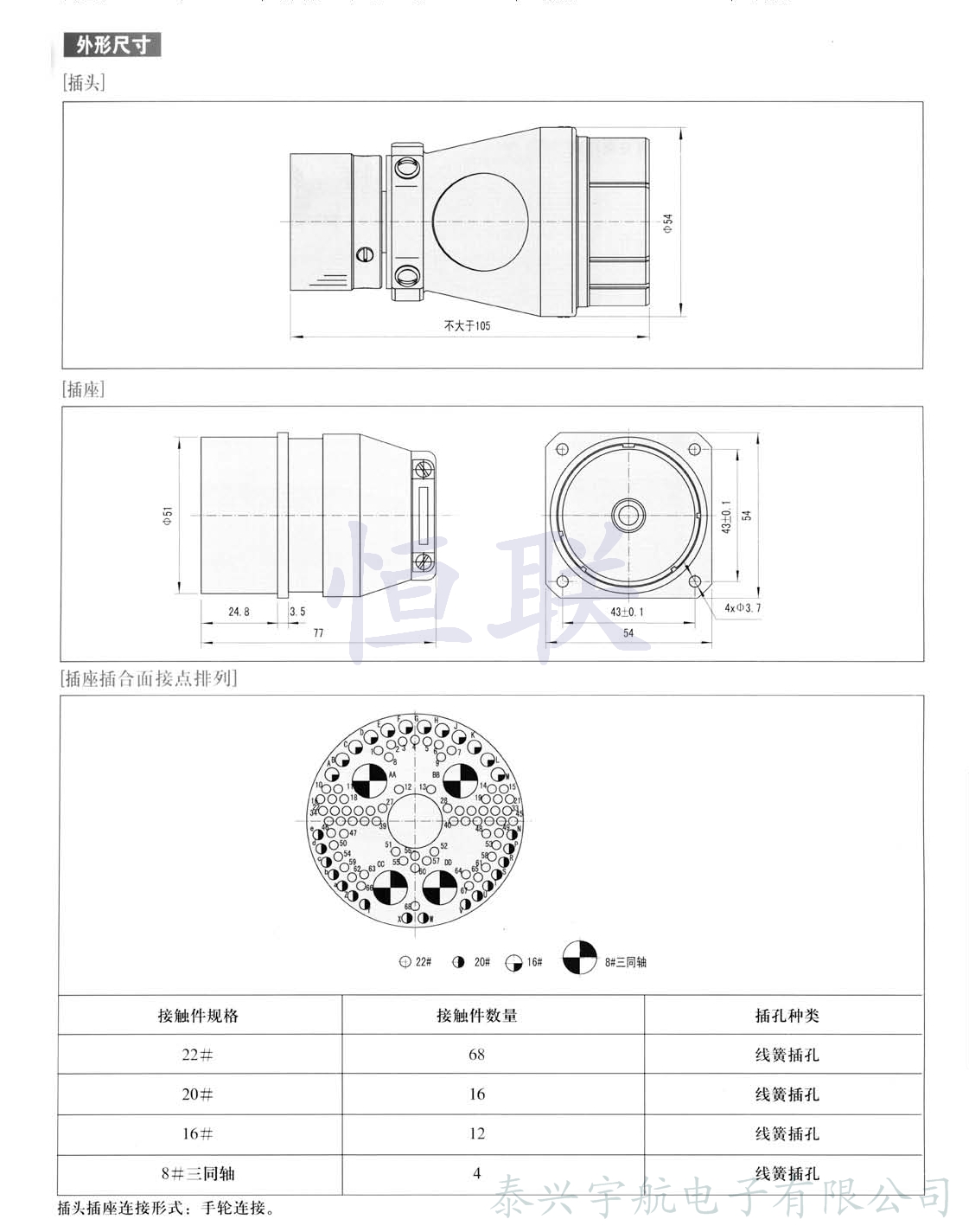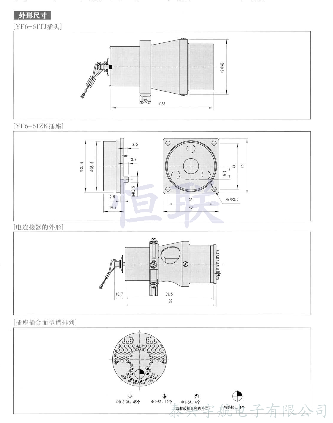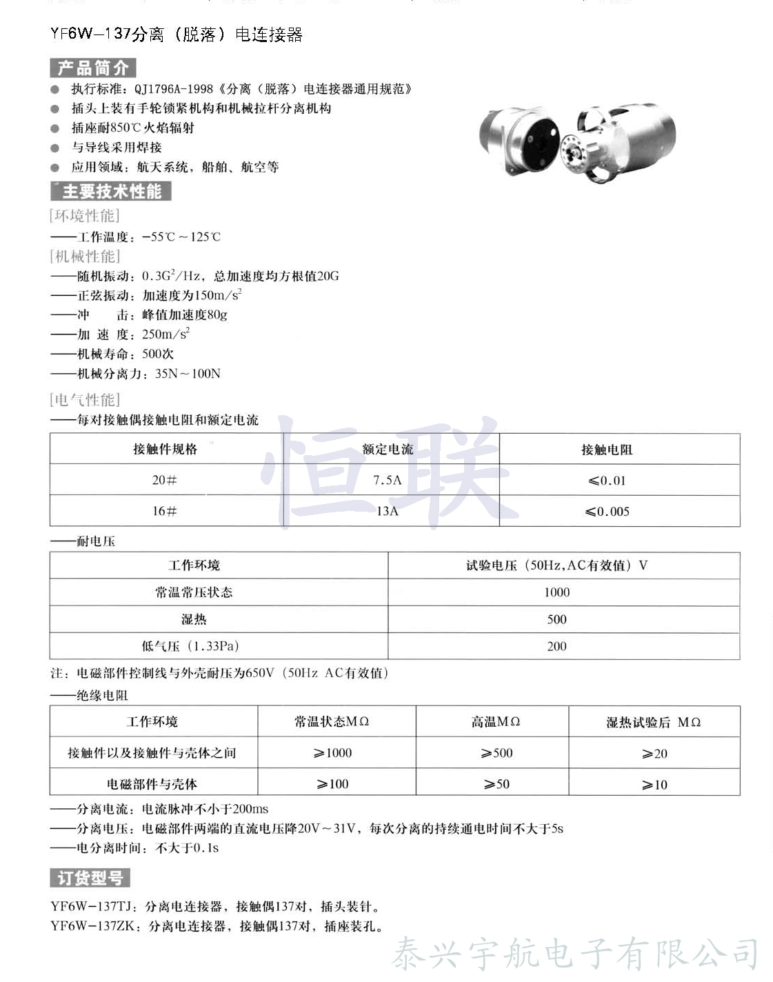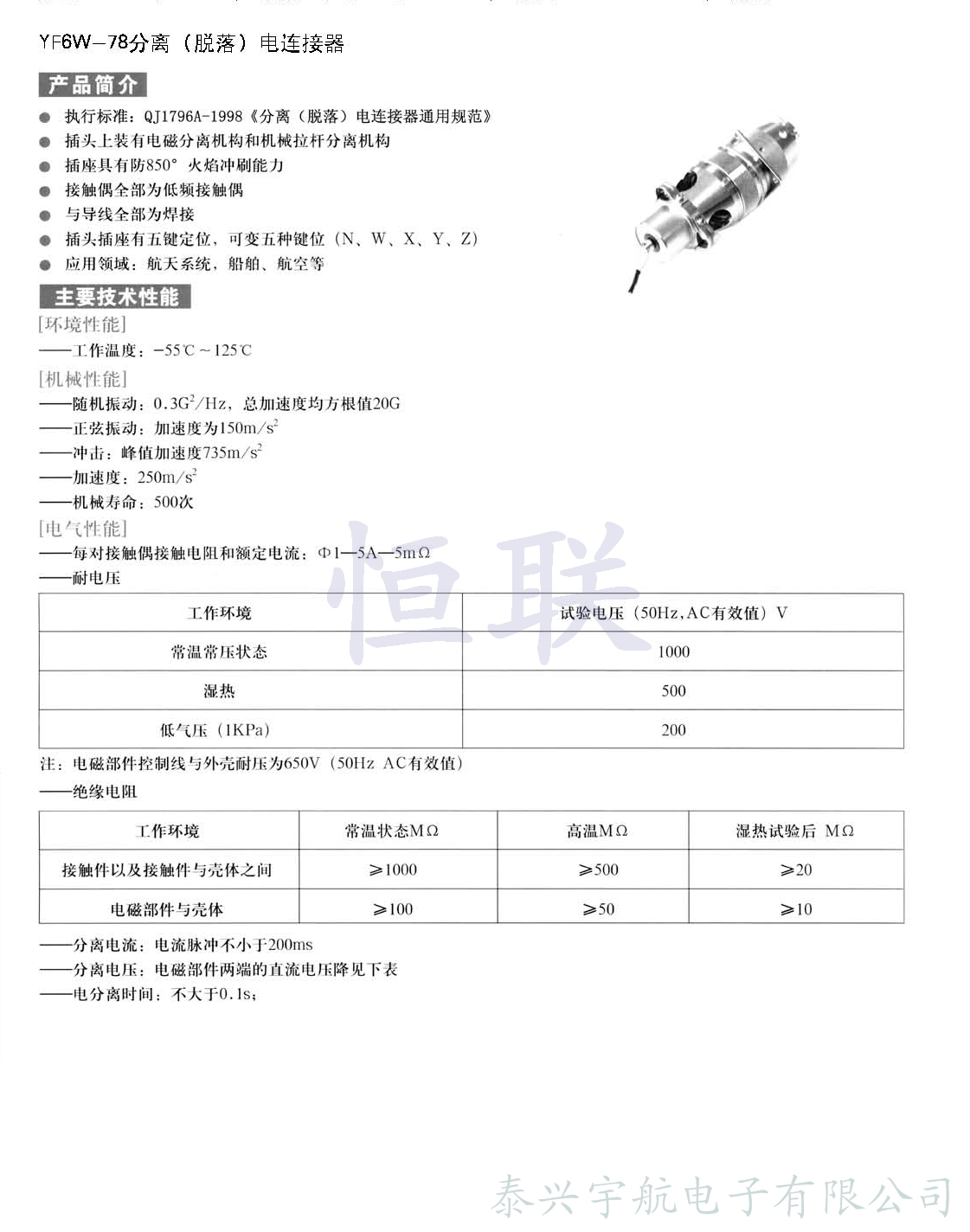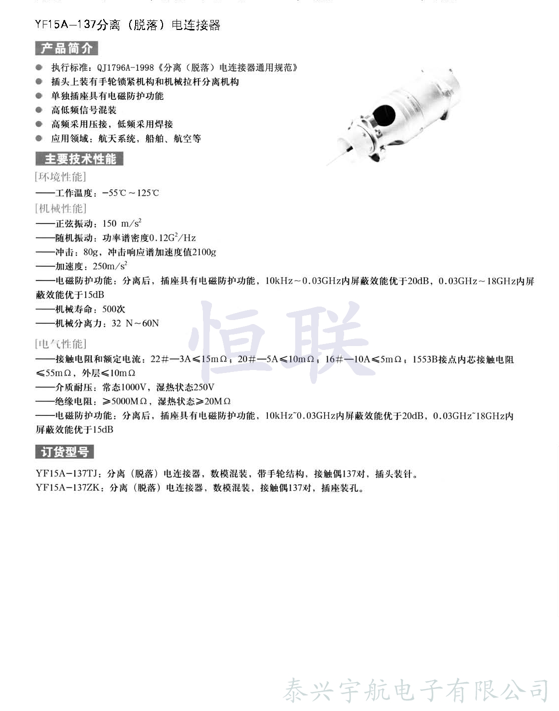 YF型圓形分離電連接器適用于具有小型化要求的戰(zhàn)略戰(zhàn)術(shù)武器系統(tǒng)、航天運(yùn)載系統(tǒng)的級(jí)間電氣線路連接和系統(tǒng)與地面設(shè)備的電路連接,以及其他工業(yè)設(shè)備的電氣連接,并可做瞬間電磁分離和機(jī)械分離。